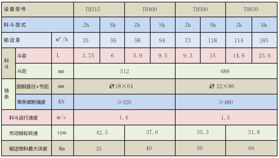 TH系列斗式提升機主要技術參數(shù)表
