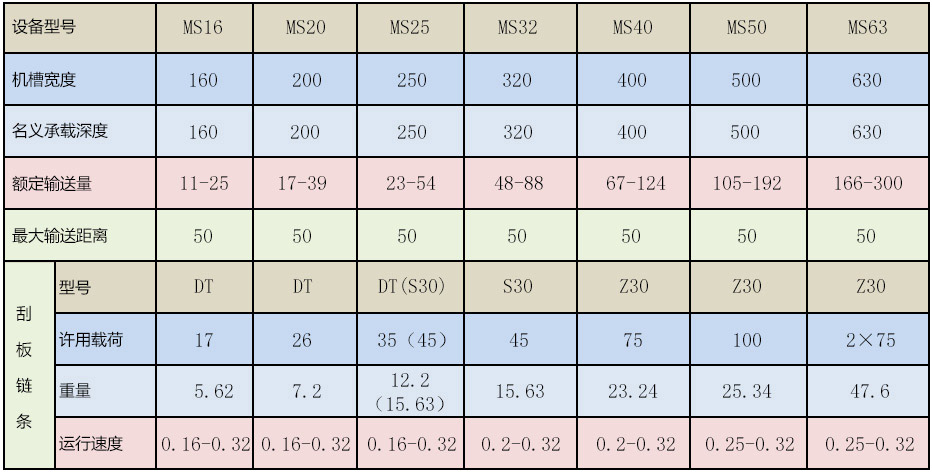 MS型埋刮板輸送機(jī)主要技術(shù)參數(shù):